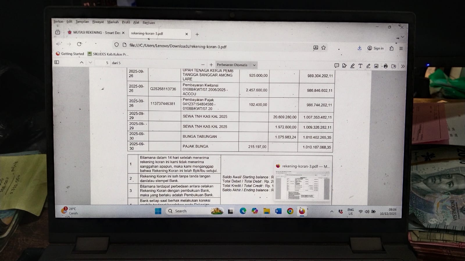 Melakukan pencetakan rekening koran pembayaran sewa tanah desa oleh sd dan puskesmas